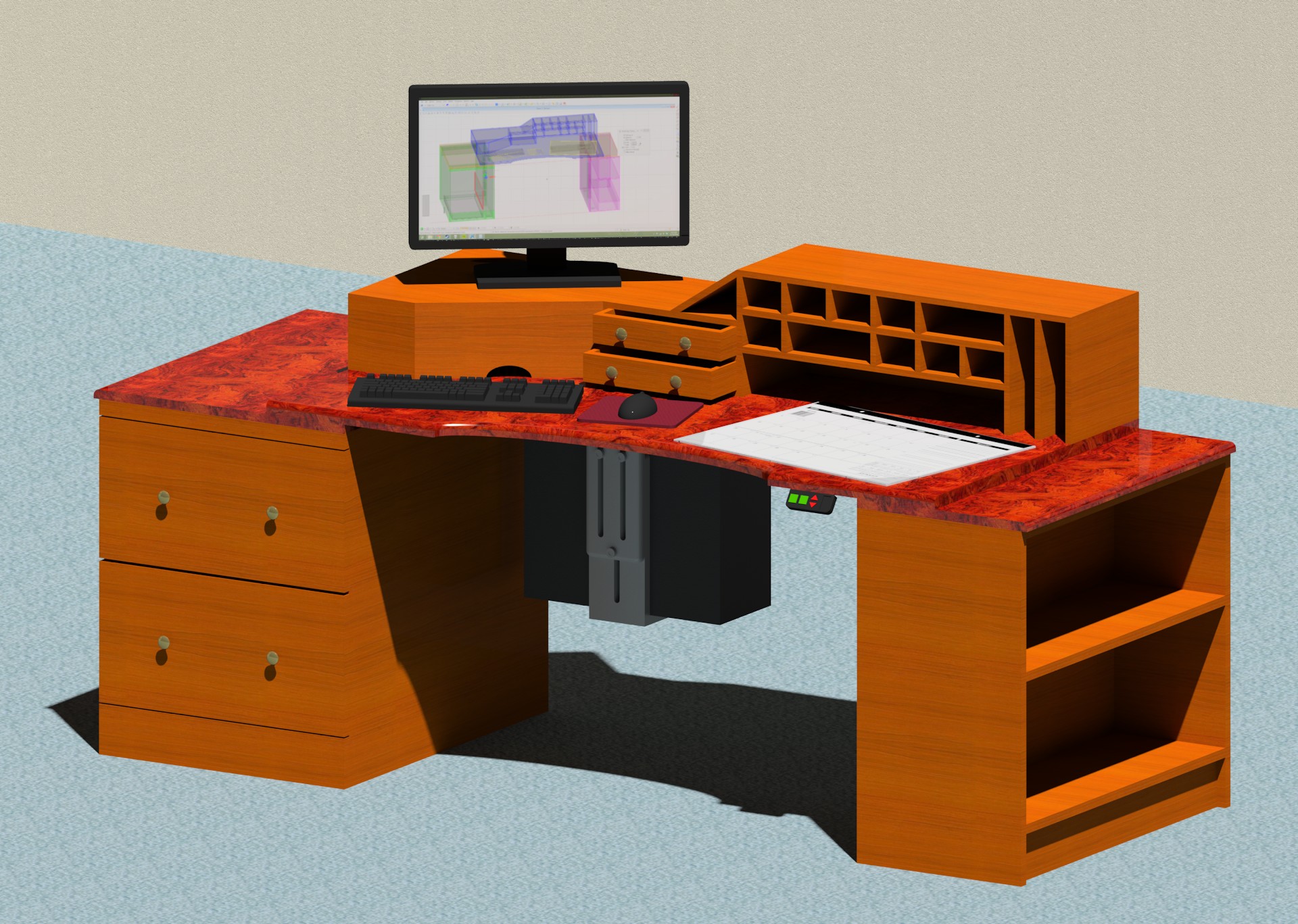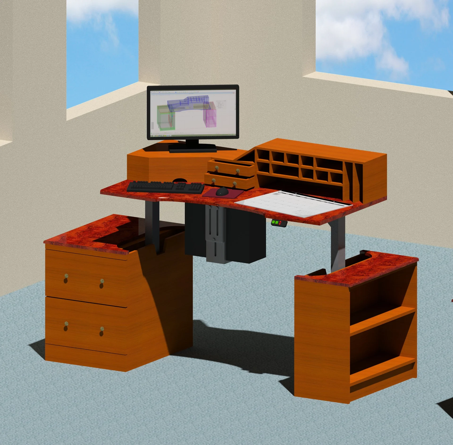 My Associates of Applied Sciences Degree in CAD required a final project for the capstone of the program. For this project we were able to create anything we wanted with any of the skills we had acquired. I chose to create a standing/sitting desk with MicroStation. My main inspiration for creating a standing sitting desk was the fact that I had to sit for the majority of the day - both at school and at my job. I also took inspiration from classic roll-top desks, which feature many small drawers and cubby holes. The majority of standing desks on the market are spartan, and tend to be little more than glorified adjustable tables. I also wanted to desk to feature spaces for cable management.